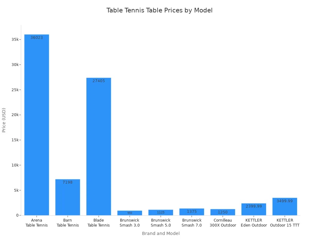 As mesas de tênis de mesa têm preços muito variados. Algumas mesas simples custam menos de US$ 1.000. As mais caras podem custar mais de US$ 30.000. A maioria das mesas para uso doméstico e de clube custa entre US$ 900 e US$ 2.500. O preço depende dos materiais, da espessura do tampo e da marca. Aqui está uma tabela com os preços de marcas e modelos populares: